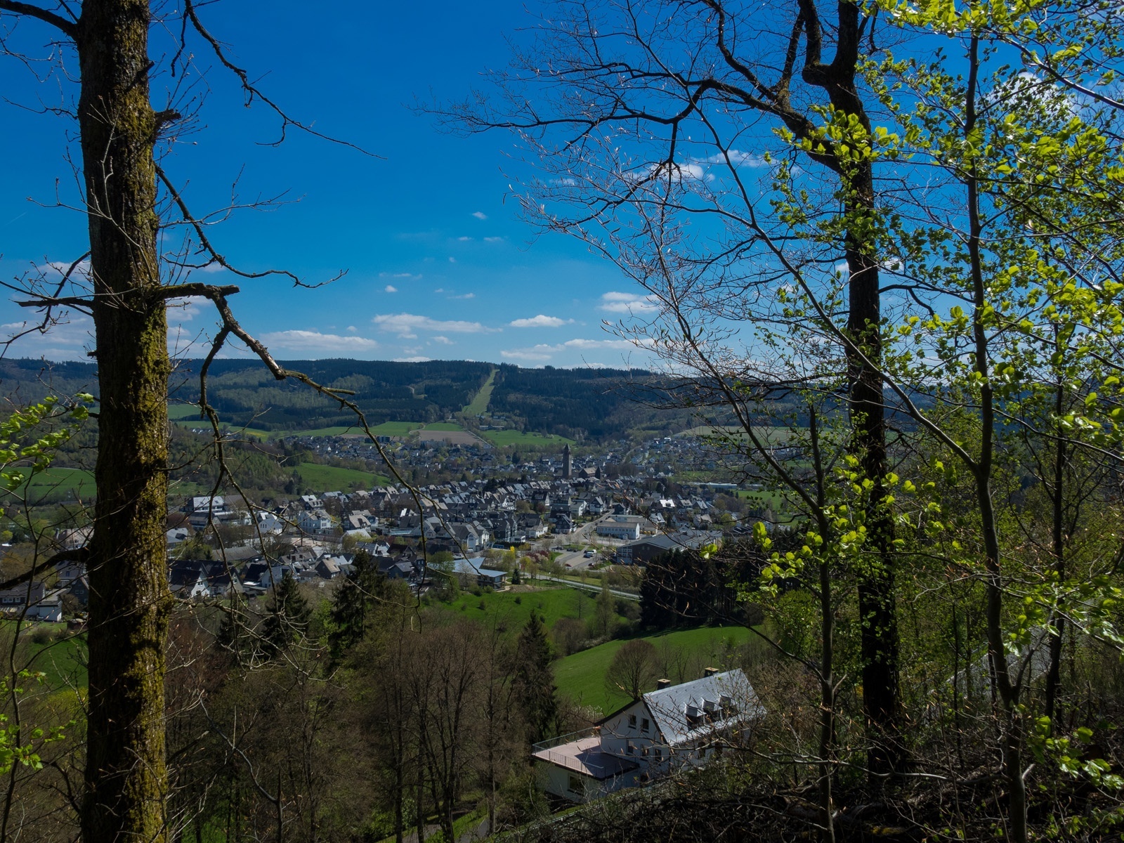 An einem Haus biegen wir rechts ab und bleiben auf dem Weg, an dessen Ende wenden wir uns wieder rechts (bergab). An der nächsten Gabelung (Hinweisschild zum Holzerlebnisparcours) gehen wir links. Wir erreichen nun die Gästeinformation Schmallenberger Sauerland und gehen rechts Richtung Stadthalle. Dort wandern wir die Straße „Paul-Falke-Platz“ bergan und erreichen unseren Ausgangspunkt, den Schützenplatz.