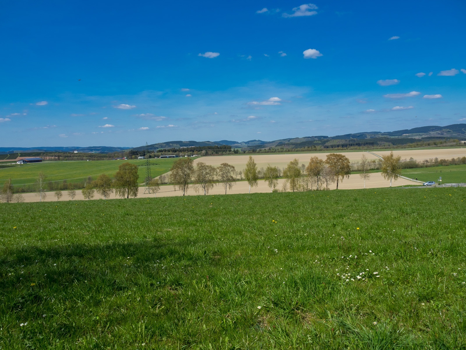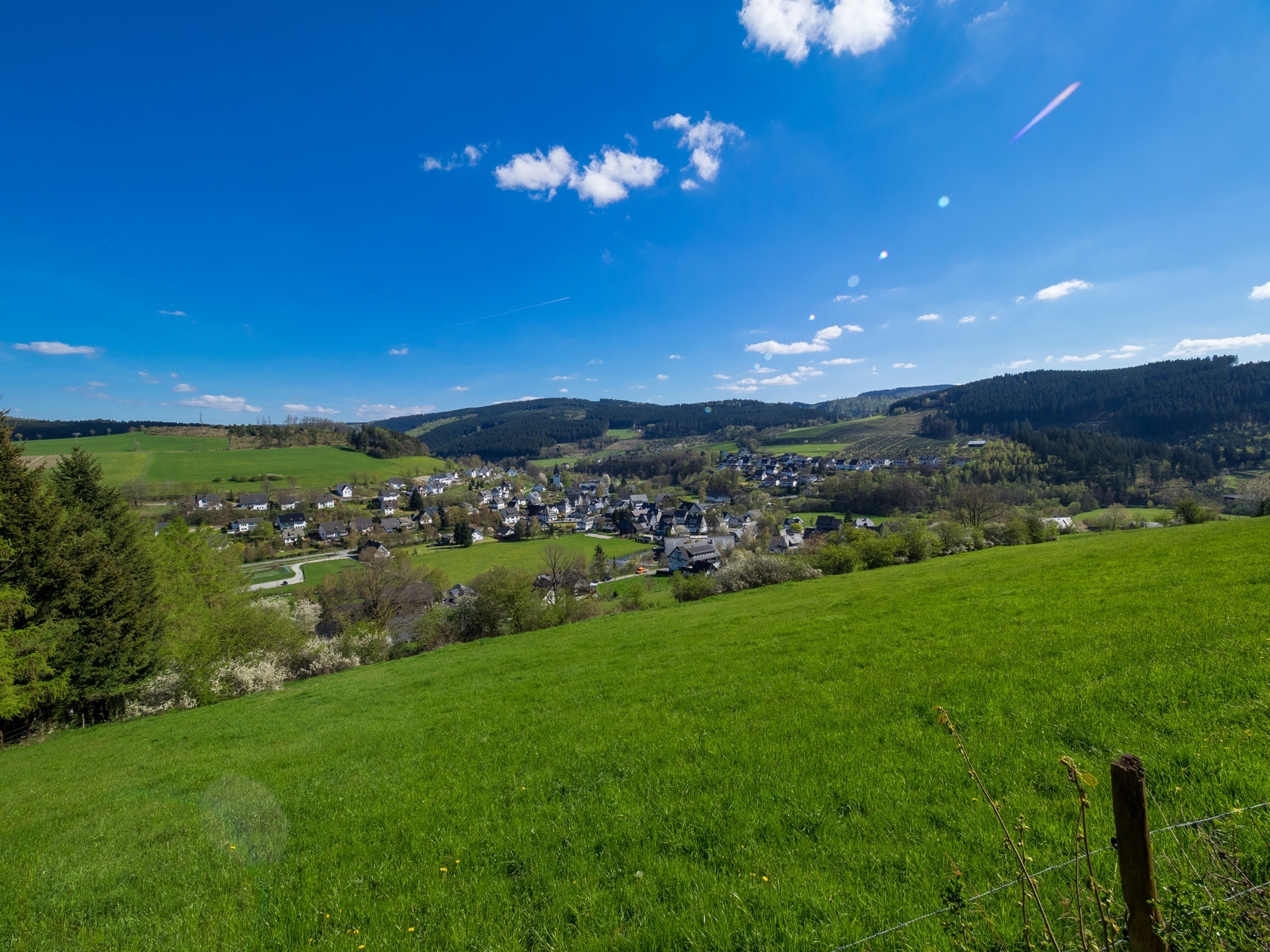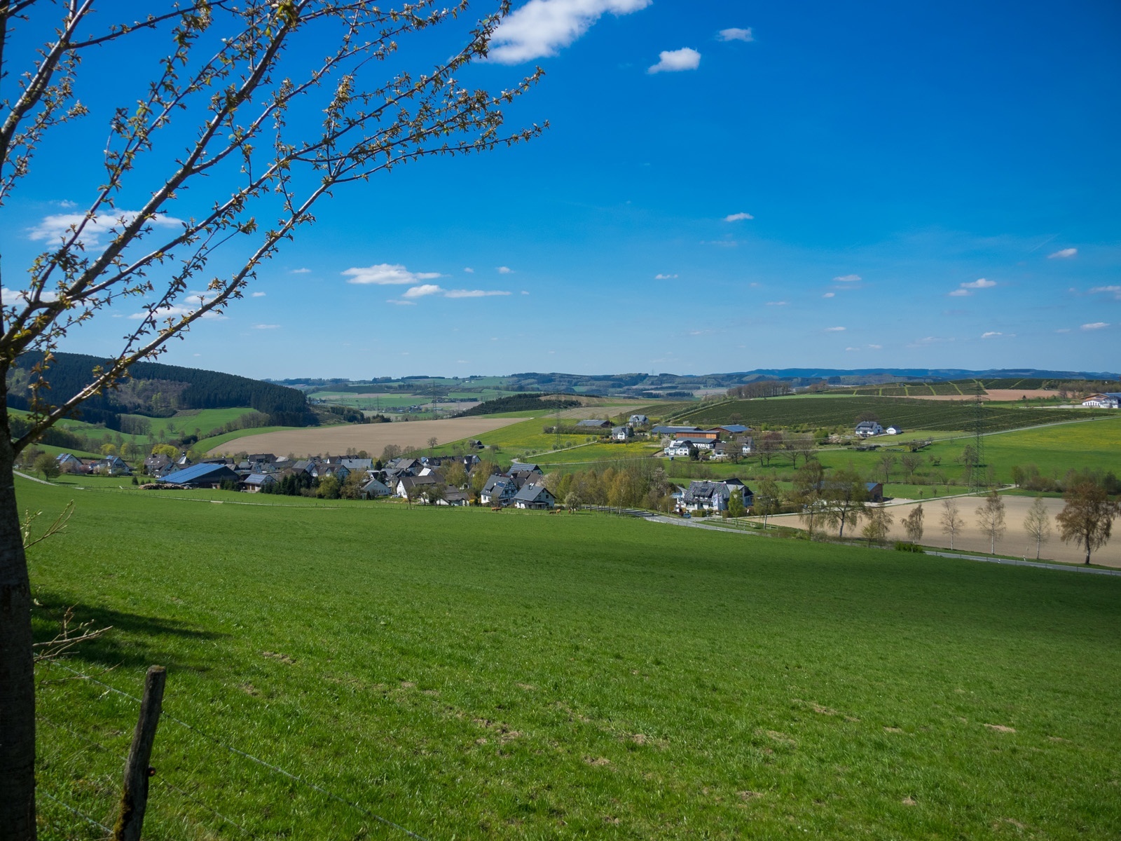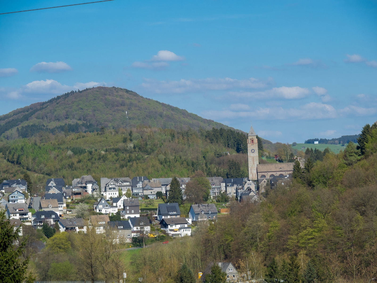 Am Kreuz wandern wir rechts und biegen nach einigen Metern links in den Feldweg ein. Wir haben einen wunderschönen Ausblick auf das Hawerland, den Ort Werpe, den Flugplatz Rennefeld, die Kapelle auf dem Kreuzberg, in Richtung Bad Fredeburg und dem „Hunau Turm“.