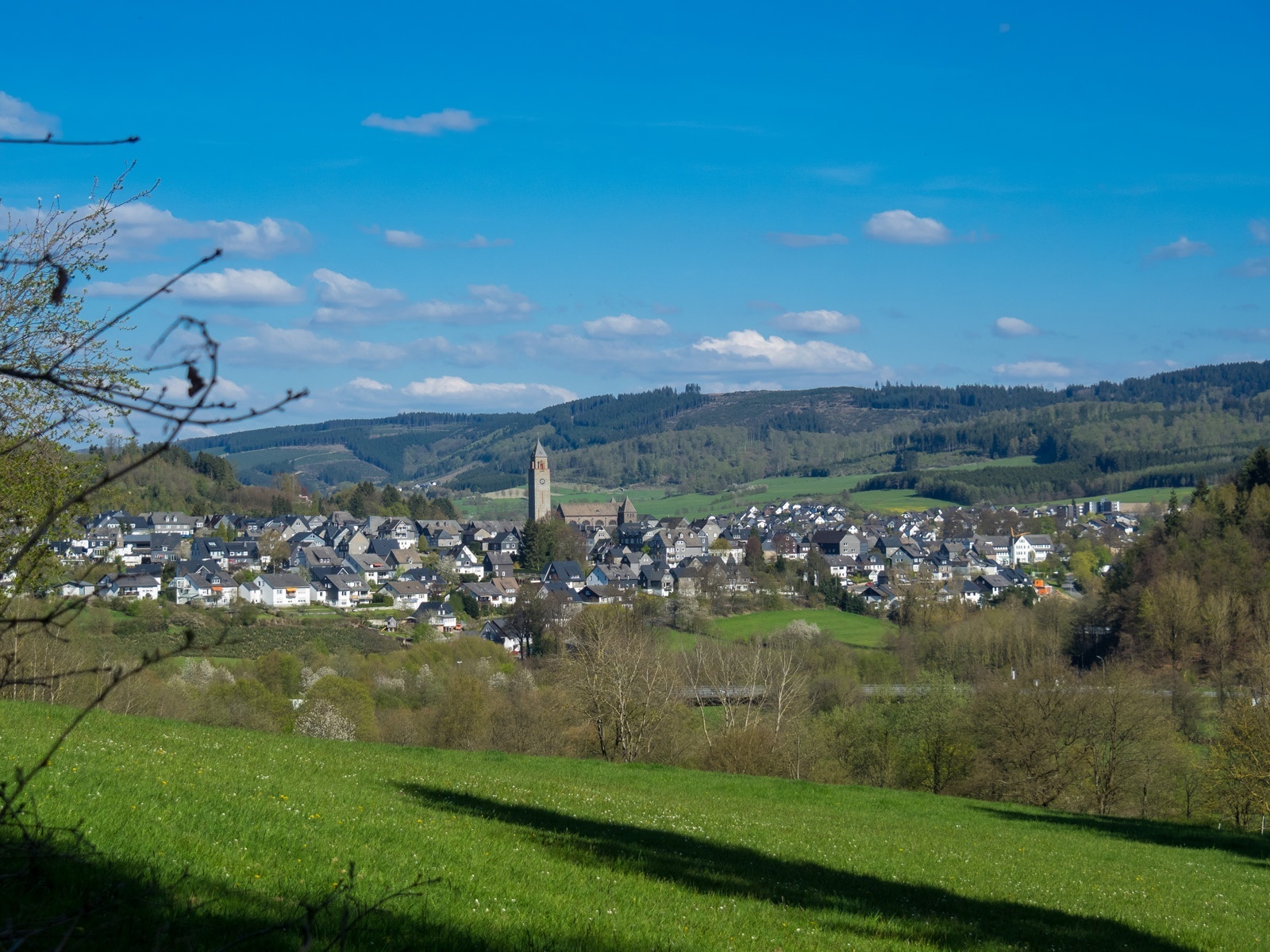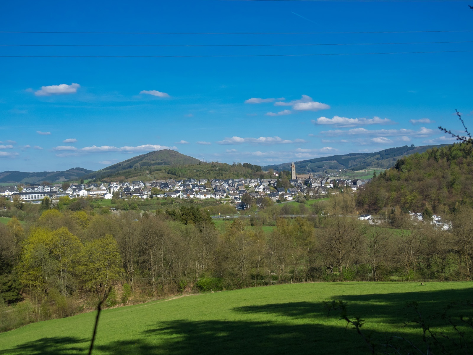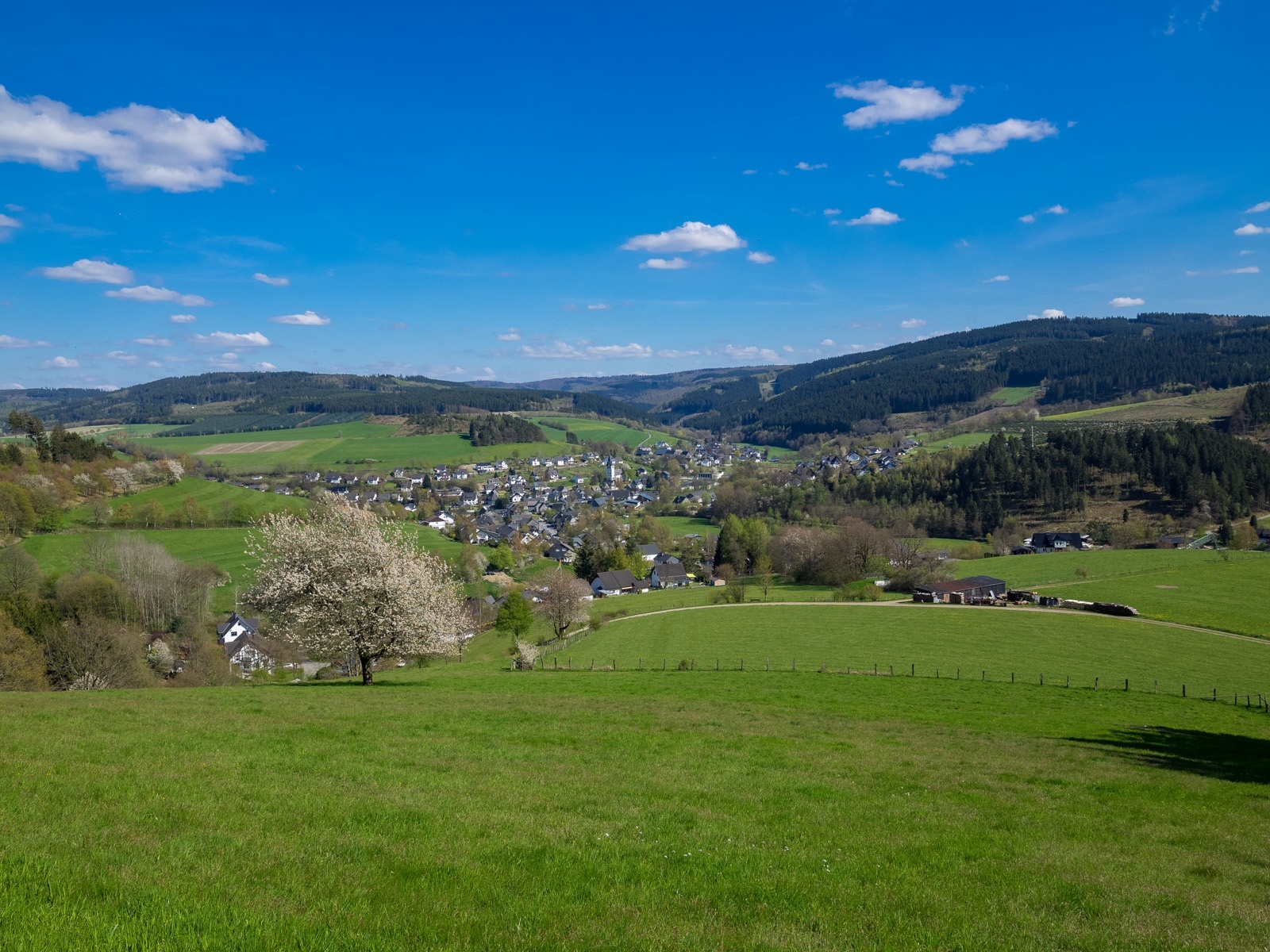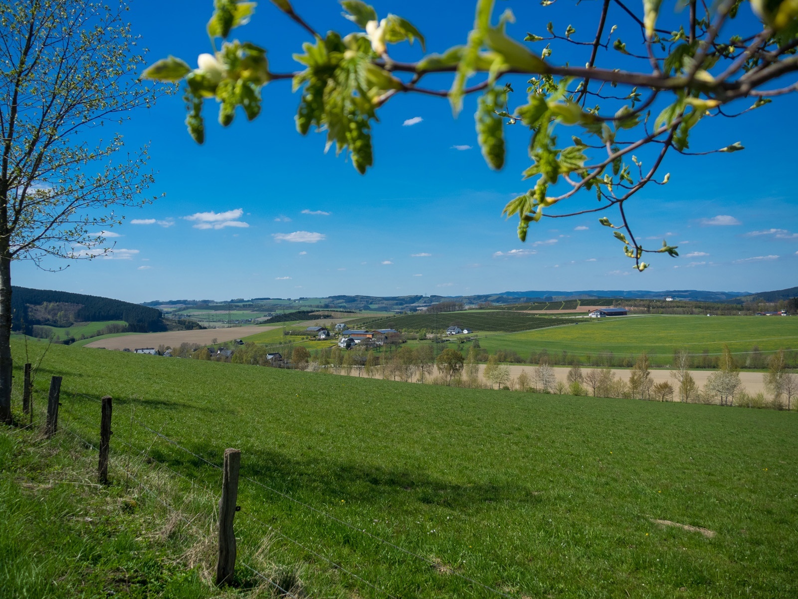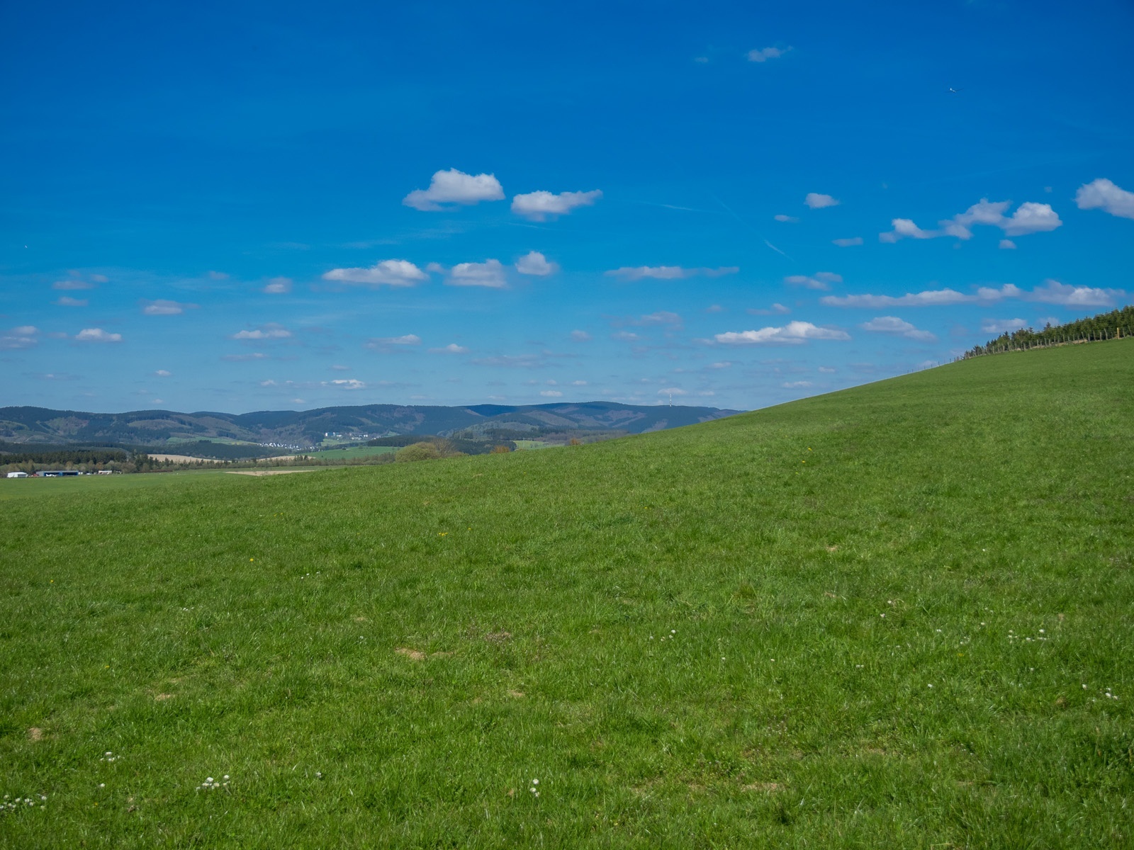 Am Kreuz wandern wir rechts und biegen nach einigen Metern links in den Feldweg ein. Wir haben einen wunderschönen Ausblick auf das Hawerland, den Ort Werpe, den Flugplatz Rennefeld, die Kapelle auf dem Kreuzberg, in Richtung Bad Fredeburg und dem „Hunau Turm“.